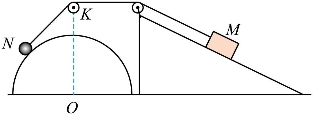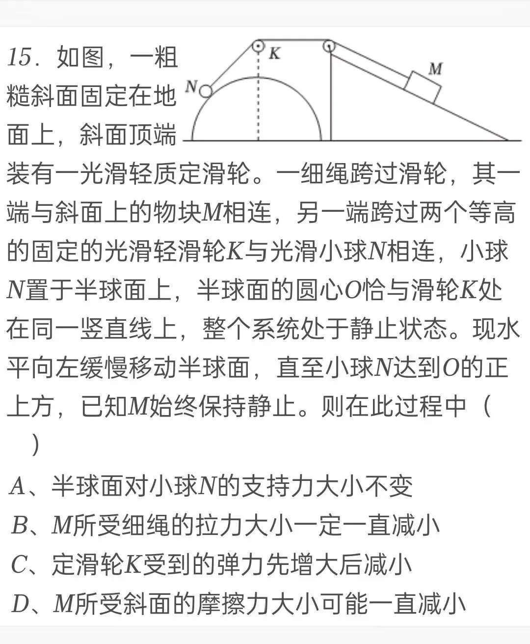 题目二、如图所示,一粗糙斜面固定在地面上,斜面顶端装有一光滑定滑轮。一细绳跨过滑轮,其一端与斜面上的物块M相连,另一端跨过固定的光滑滑轮K与光滑小球N相连,小球N置于半球面上,半球面的圆心O恰与滑轮K处在同一竖直线上,整个系统处于静止状态。现水平向左缓慢移动半球面,直至小球N达到O的正上方,已知M始终保持静止。则在此过程中( )