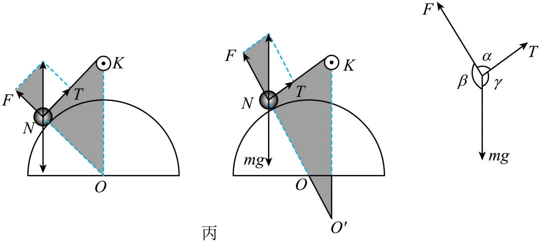 AB.对小球N进行受力分析,受重力mg、半球面对小球N的支持力F和受细绳的拉力T,如图甲所示,当半球面向左缓慢移动少许后,容易得到如图甲中的两个相似阴影三角形;当半球面向左缓慢移动少许后,如图乙所示,相似关系仍然存在,由相似关系和由平衡条件可得小球受力图如图丙所示,设∠KNO为α,∠KON为β,∠NKO为γ,则有