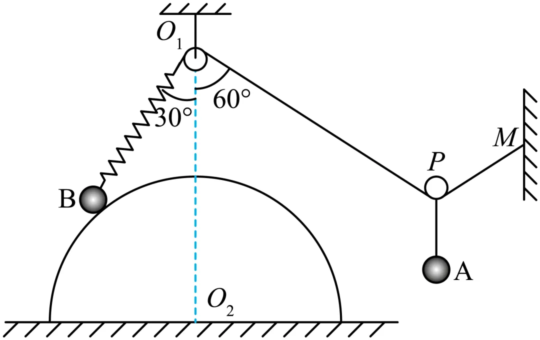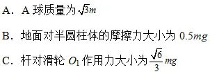 题目三、如图所示,小球A通过小滑轮P用细线悬挂在空中,细线一端固定在点,另一端跨过小滑轮O1连接一弹簧。弹簧下端与小球B连接,小球B置于粗糙水平面上的光滑半圆柱体上,两球均处于静止状态。已知B球质量为m,小滑轮O1用轻杆固定在半圆柱体圆心的正上方,O1B与竖直方向成30°角,O1B长度与半圆柱体半径相等,O1P与竖直方向成60°角,细线、滑轮、弹簧质量可忽略不计,则下列叙述正确的是()