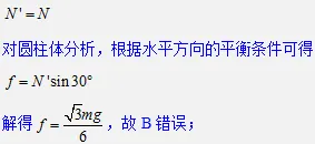 方向与竖直方向夹角为30°,则根据牛顿第三定律,B对圆柱体压力