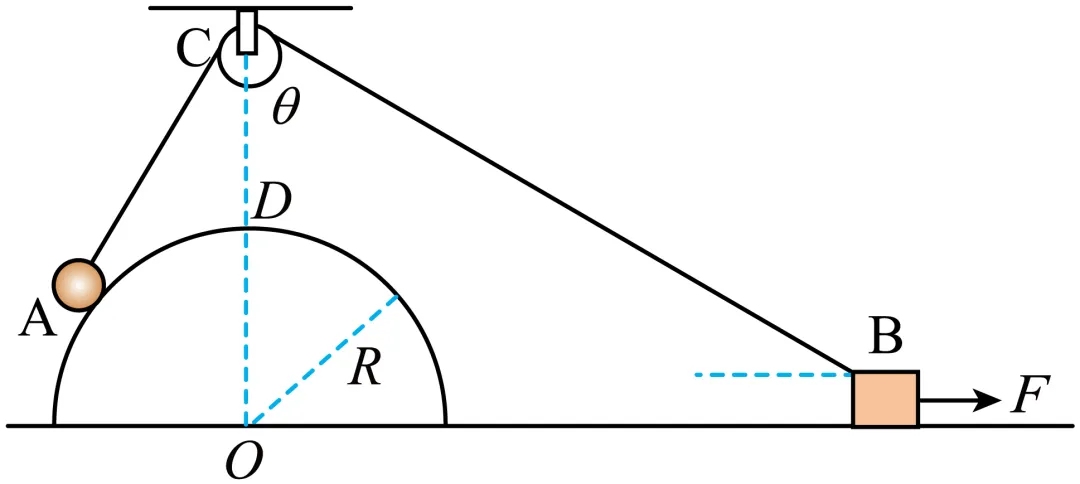 题目四、如图,一轻绳绕过定滑轮C(半径可忽略)一端连接小球A(可视为质点),另一端连接物体B。物体B放在粗糙水平地面上,受到水平向右的力F的作用,使得小球A沿光滑固定的半球面从图示位置缓慢向上移动,定滑轮C在半球面球心O的正上方,已知OC的长度为2R,半球面的半径为R。小球A向上移动到球心O正上方D点的过程中,下列说法正确的是( )