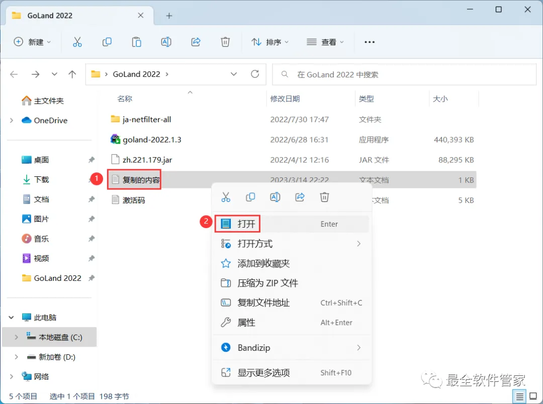 26、回到GoLand 2022文件夹,找到【激活码】文件,右键【打开】它