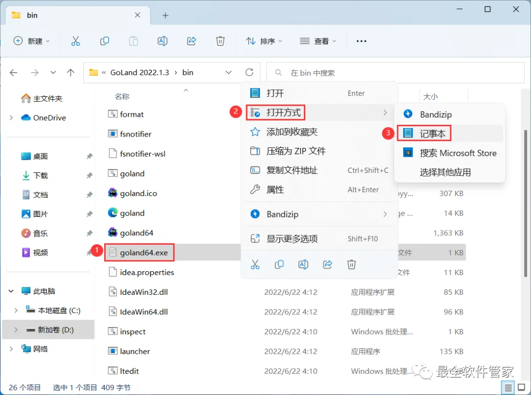 41、找到并选中【goland64.exe】文件,右键依次点击【打开方式】、【记事本】