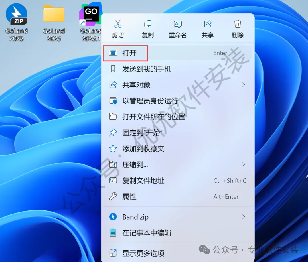 10、回到桌面,右键桌面上的【GoLand 2025软件图标】,点击【打开】