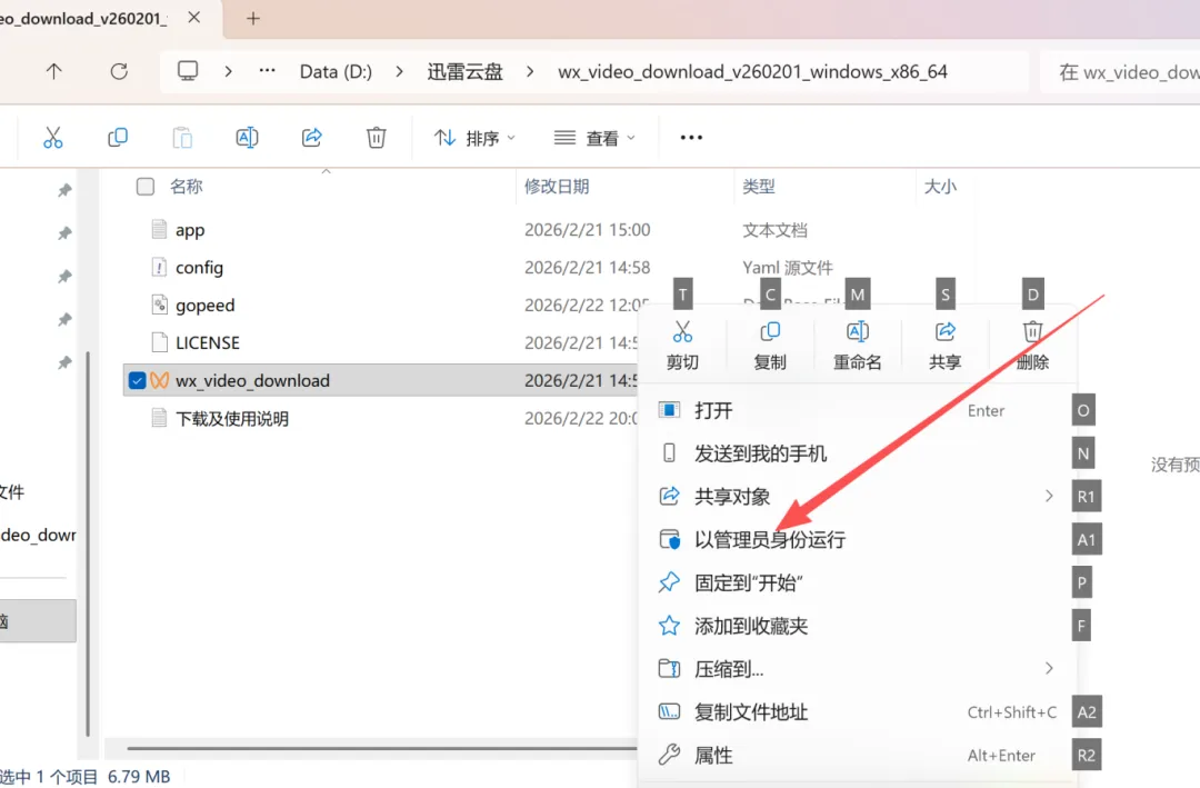2、右键点击 “wx_video_download”,选择以管理员身份运行软件。