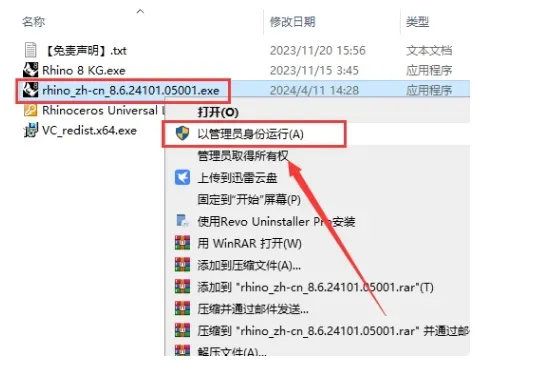 2. 选择【rhino_zh-cn_8.6.24101.05001.exe】,鼠标右键以管理员身份运行。
