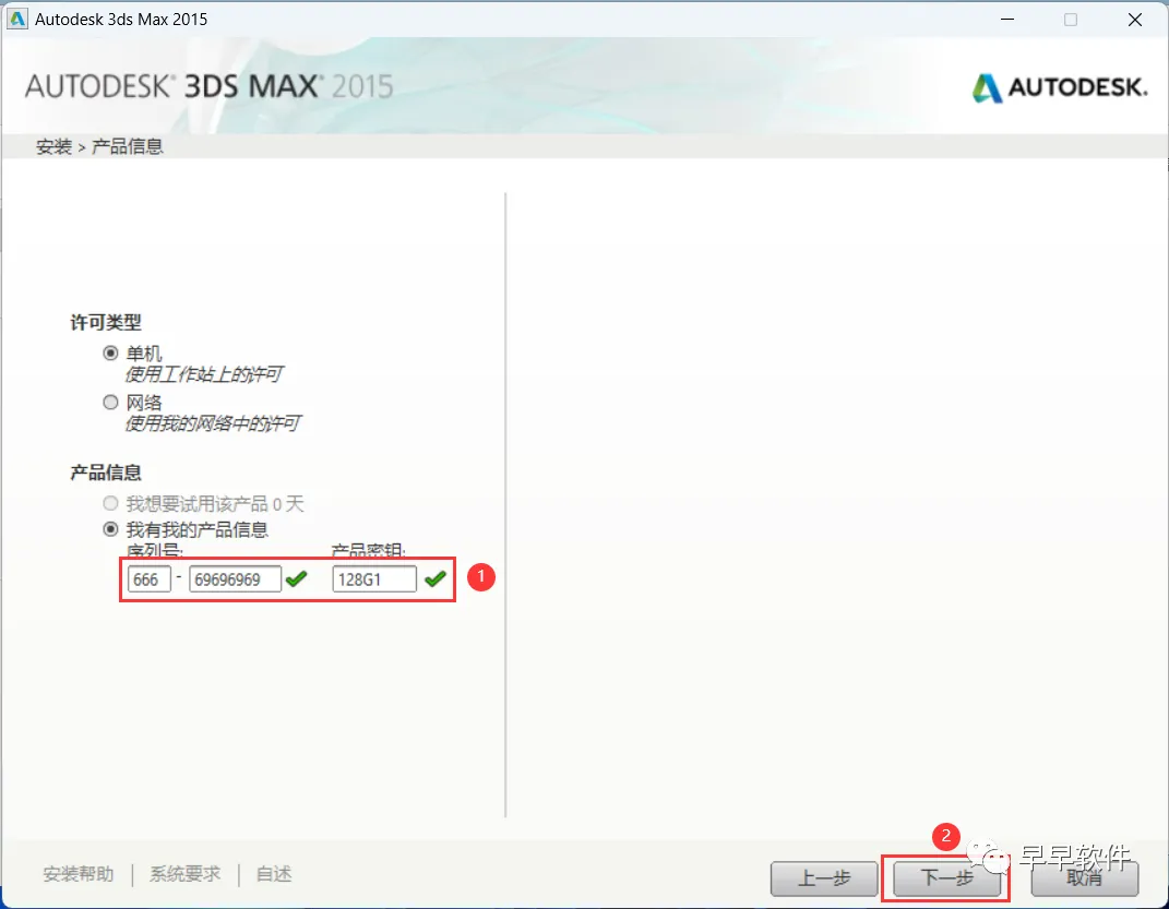 7、序列号输入:666-69696969,产品密钥输入:128G1,再点击【下一步】