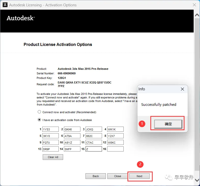 19、打开软件界面,将软件的【Request code】填入到程序的【Requset】内,再点击【Generate】,将程序的【Activation】填入到软件的【I have an…】内,再点击【Patch】