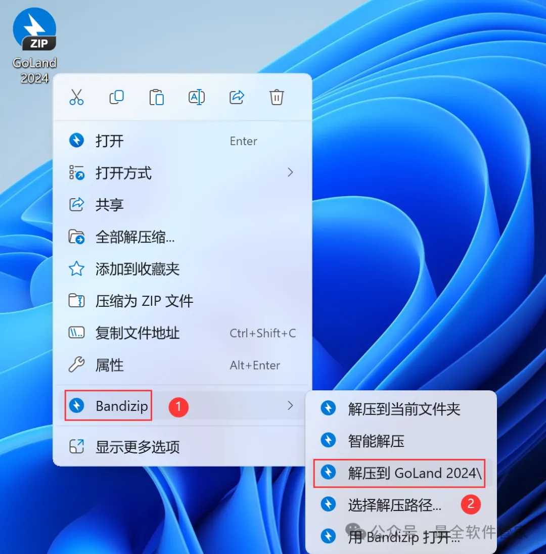 1、下载GoLand 2024软件安装包到电脑上,右键选择【解压到GoLand 2024\】