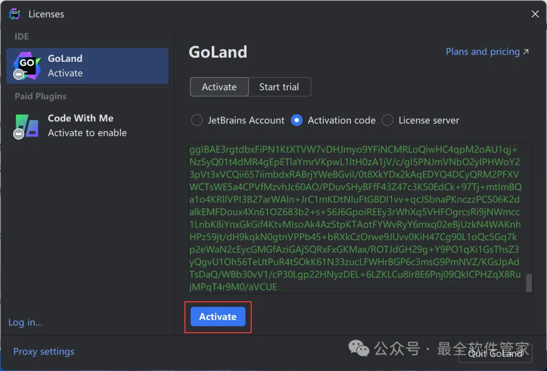 23、回到GoLand 2024软件界面,点击【Activation code】,再右键的空白处,点击【Paste】