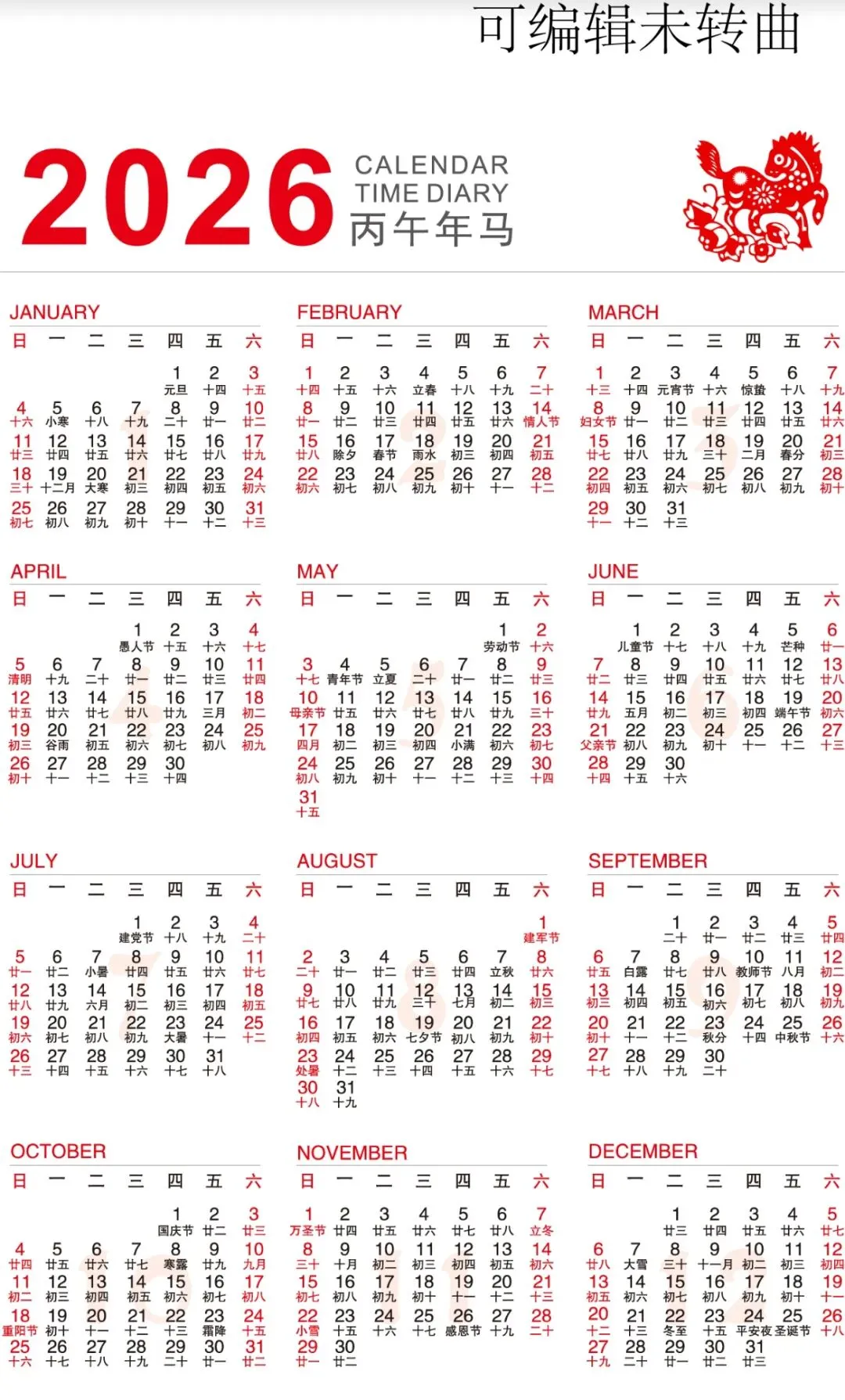 免费下载!最新2026全年高清日历台历表电子版excel可打印