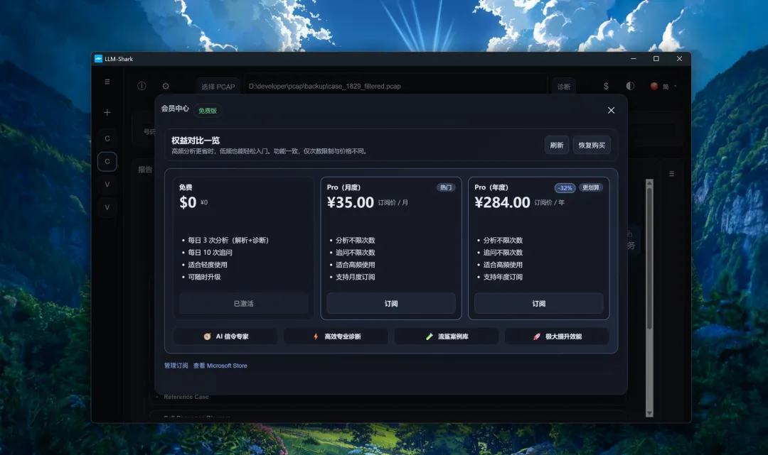 正式版1.0改进了答复内容的组织和呈现,可以按子标题展开收起,阅读时可以更方便地找到子标题。缺省状态只显示诊断结论,大模型的英文思考过程已自动收起,相信绝大多数人并不会阅读这个部分。更多界面使用效果的截图可在微软应用商店的产品页查看。LLM-Shark 正式版支持永久免费使用,每日3次原始码流(Pcap)分析诊断 + 10次追问,比v0.1早期试用版略有放宽,适合轻度使用者选用。对于短期的重度使用者建议选择月度订阅,量大管饱,无次数限制。对于长期的重度使用者建议选择年度订阅,性价比更高,优惠 32%。