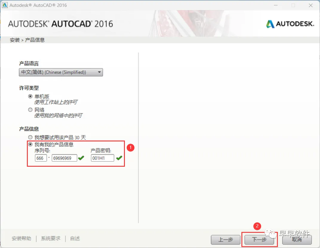 7、序列号输入:666-69696969,产品密钥输入:001H1,再点击【下一步】