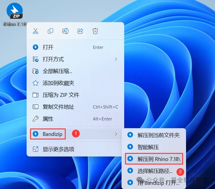 1、下载Rhino 7.18软件安装包到电脑上,右键选择【解压到Rhino 7.18\】
