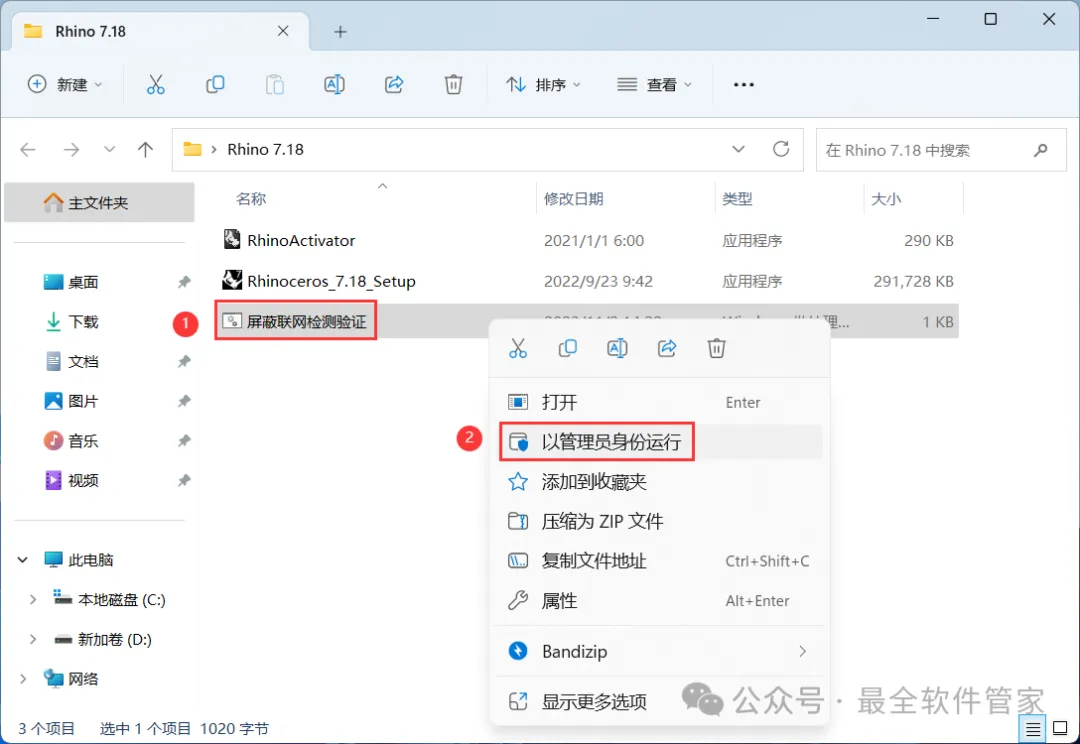 8、回到Rhino 7.18文件夹,找到【屏蔽联网检测验证】程序,右键选择【以管理员身份运行】它
