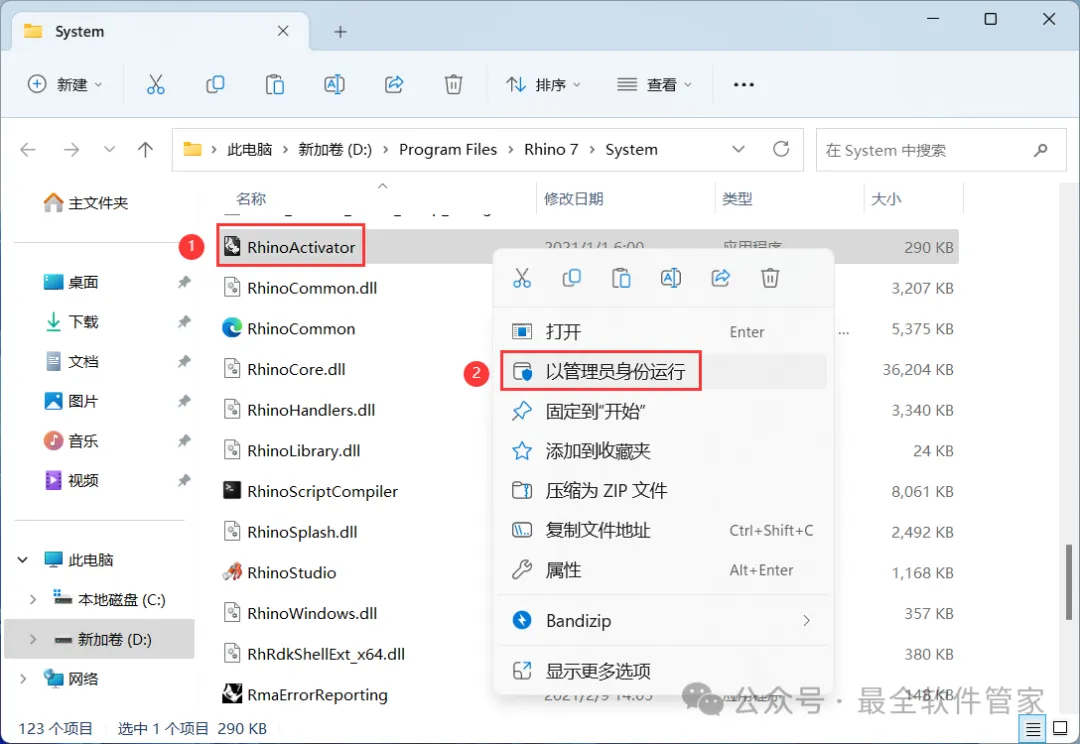 13、找到粘贴的【RhinoActivator】程序,再右键选择【以管理员身份运行】它