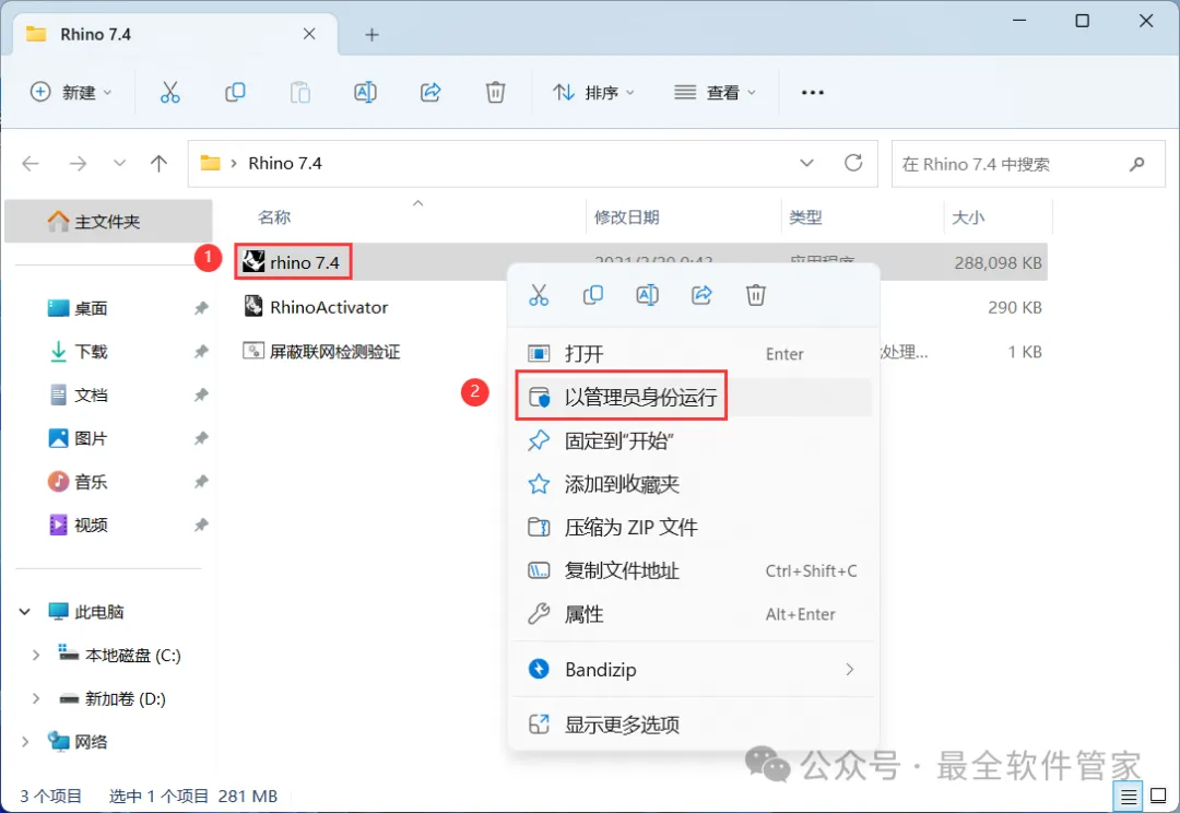 1、下载Rhino 7.4软件安装包到电脑上,右键选择【解压到Rhino 7.4\】
