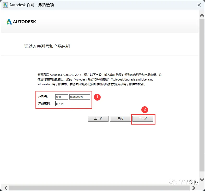 18、序列号输入:666-69696969,产品密钥输入:001J1,再点击【下一步】