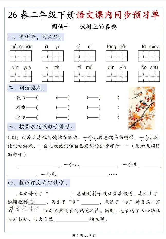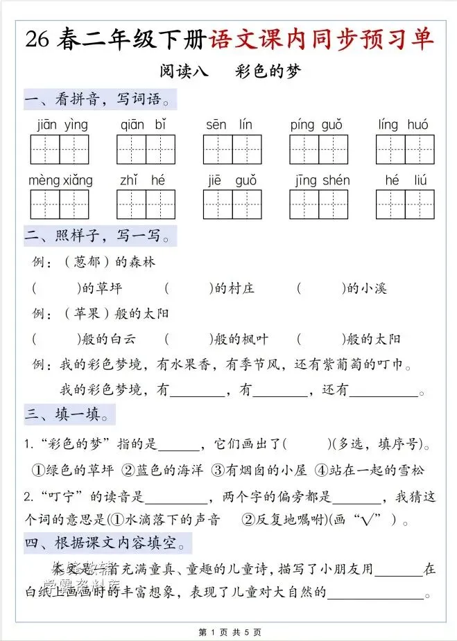 今天给大家整理了26春二年级语文下册第四单元预习单,转发给朋友或班级群,受益更多人,帮助孩子学习!
