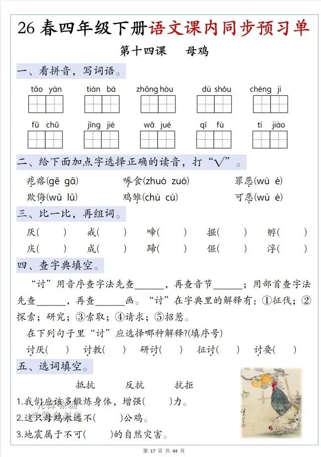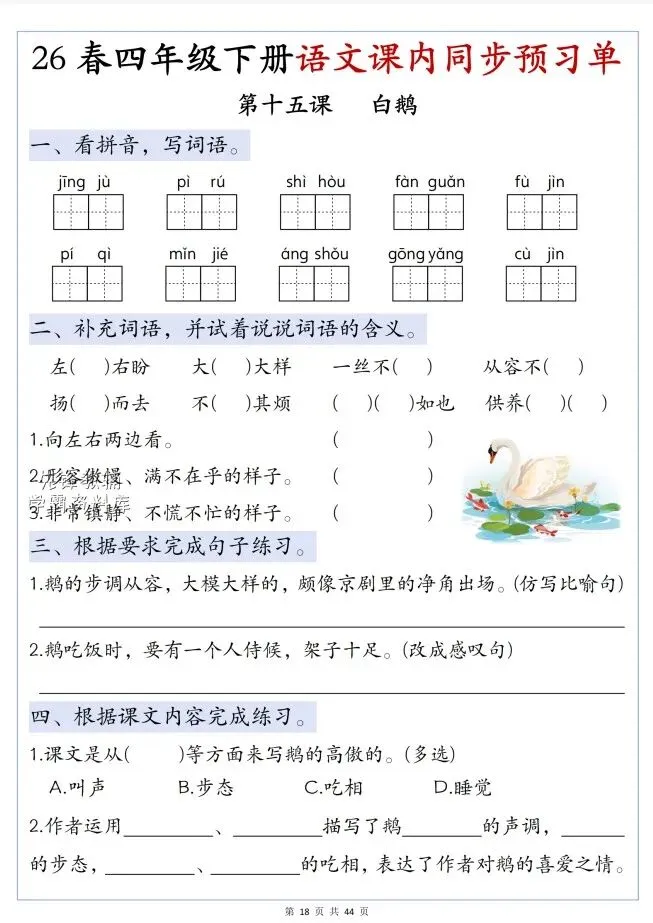 今天给大家整理了26春四年级语文下册第四单元预习单,转发给朋友或班级群,受益更多人,帮助孩子学习!