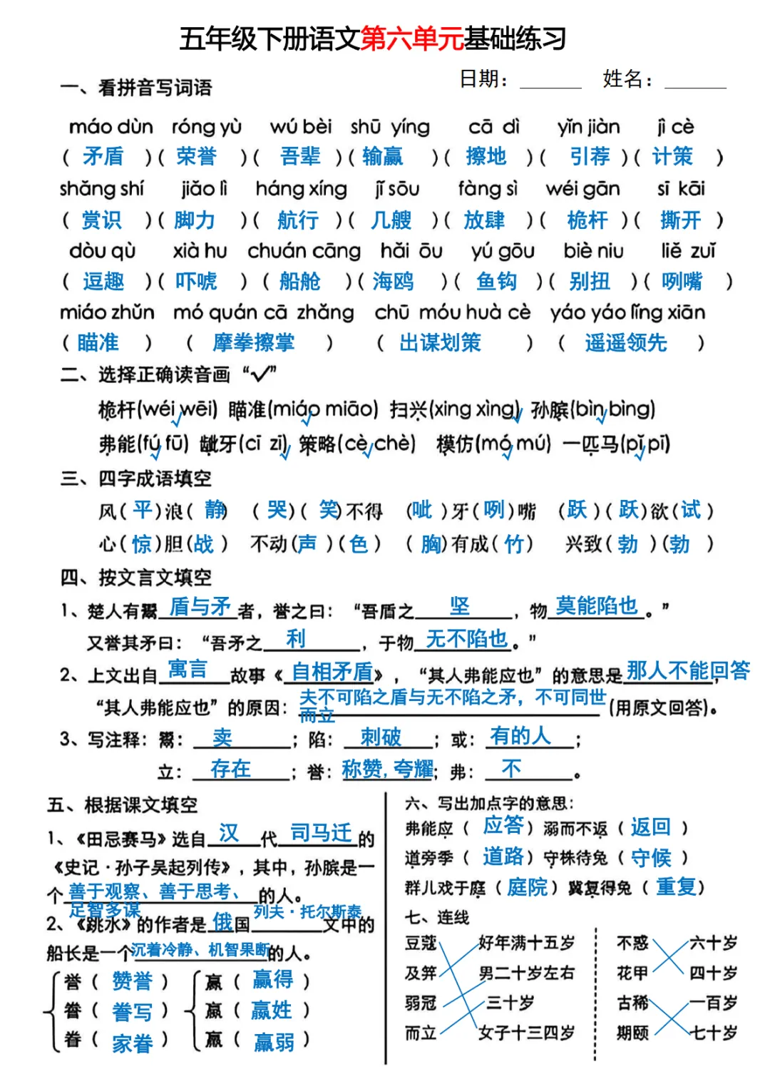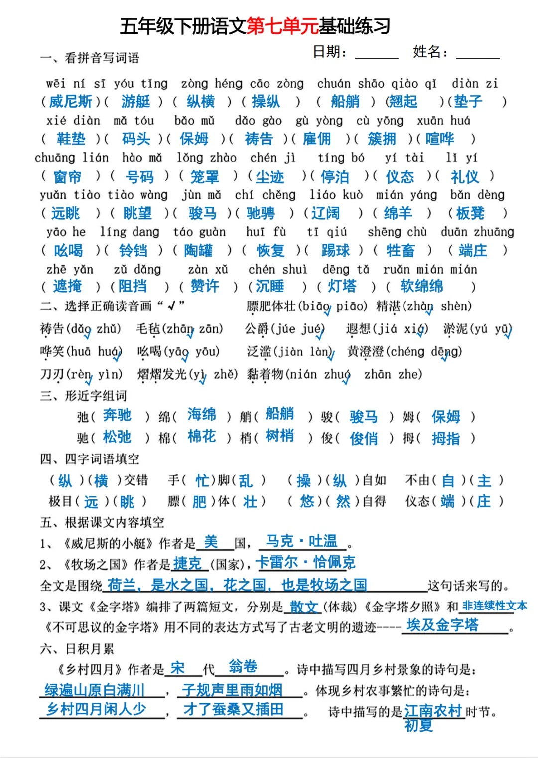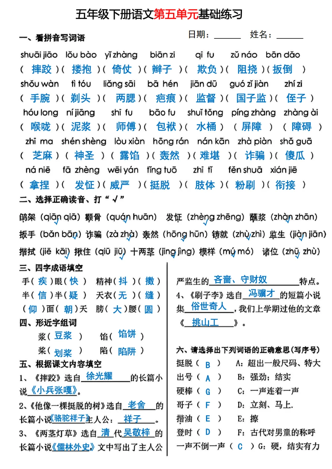 【免费下载】五年级(下)语文 第5-8单元基础练习