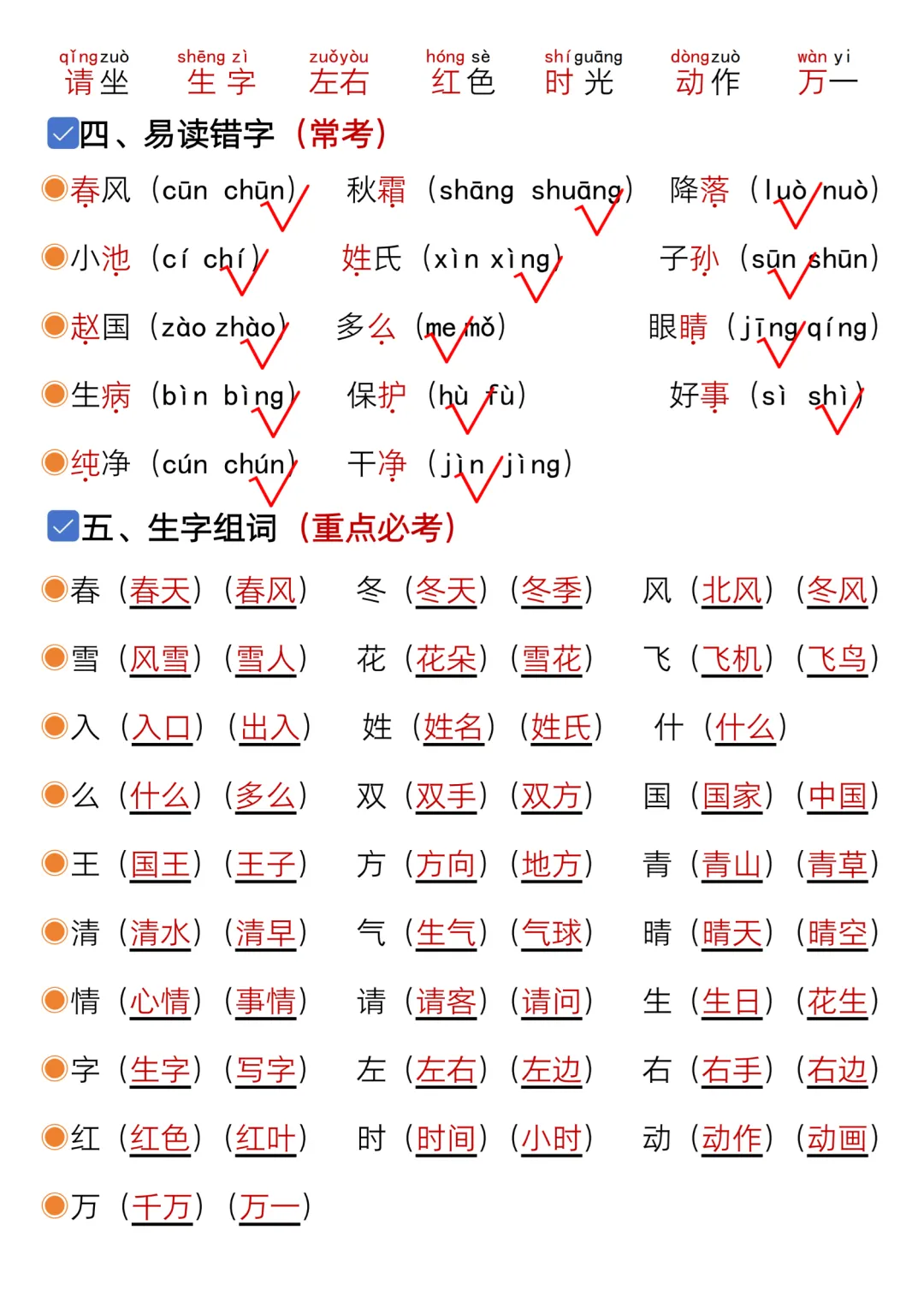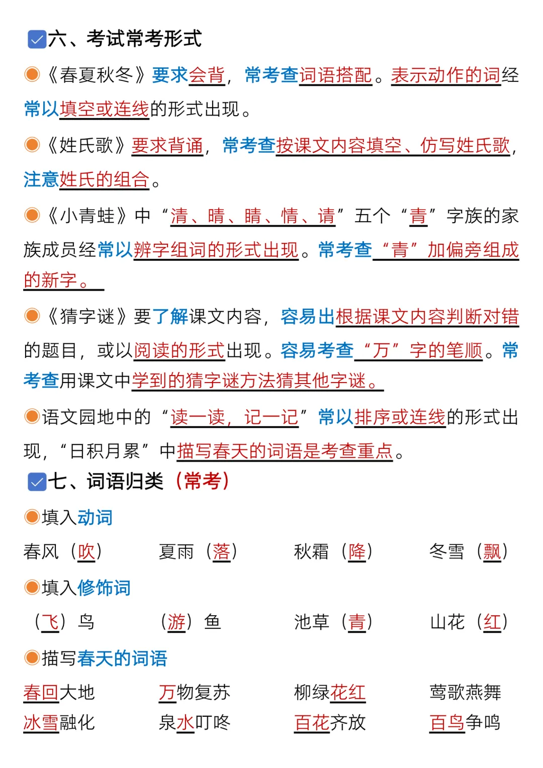 【免费下载】一年级(下)语文 1-8单元考点总结+练习