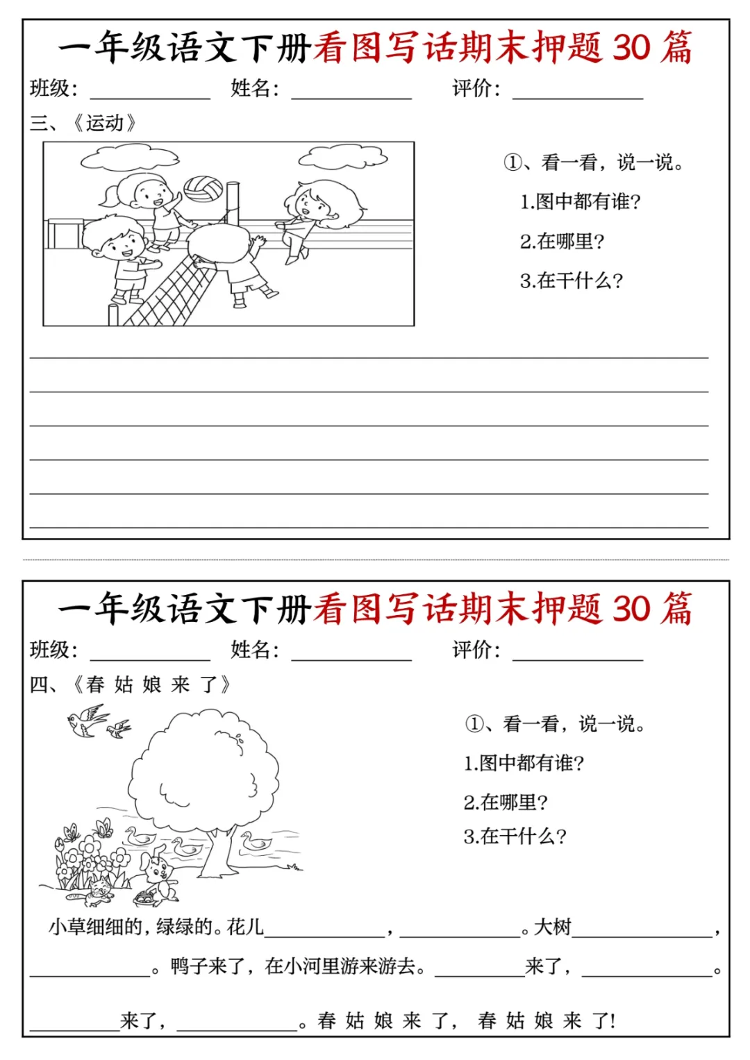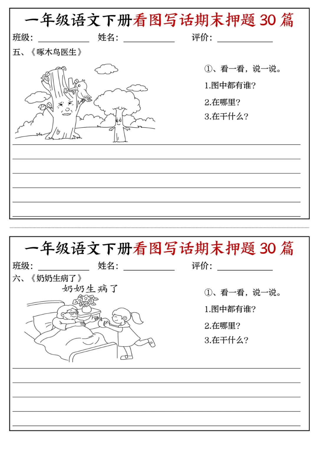 【免费下载】一年级(下)语文 看图写话期末押题30篇(含范文22页)