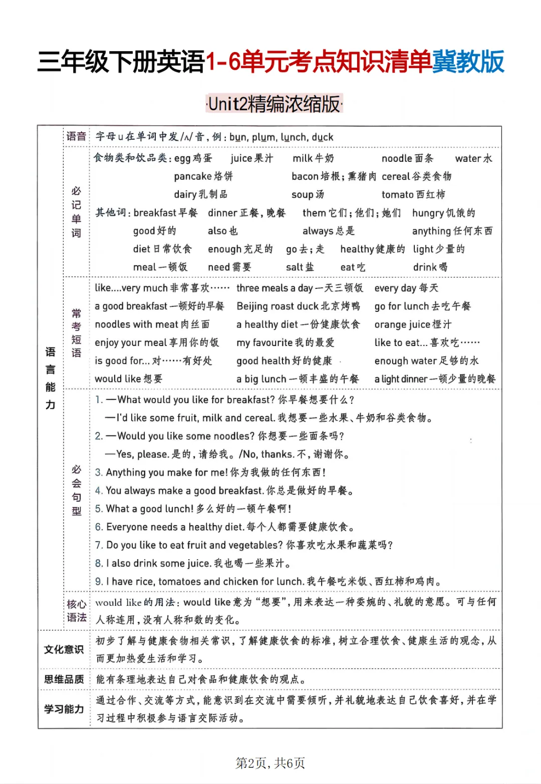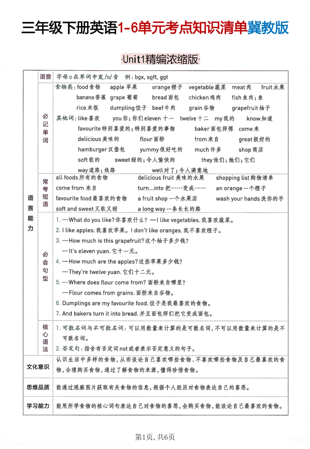 【免费下载】三年级(下)英语 1-6单元考点知识清单《冀教版》,PDF电子版,共6页,可打印