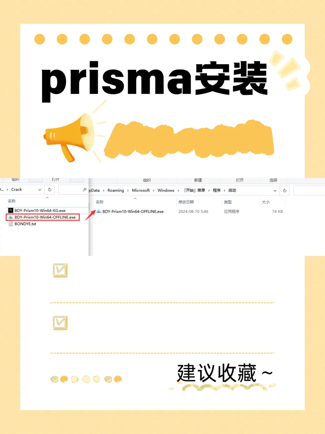 按住键盘中的Windows+R并输入命令“shell:startup”运行它,接着将BONDYE\Crack文件夹中的BDY-Prism10-Win64-OFFLINE.exe复制到当前文件夹(在脱机模式下使用Prism需要此程序。)。