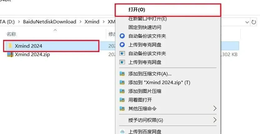 1.打开下载的Xmind 2024软件安装包,鼠标右击压缩包选择【解压到当前文件夹】。