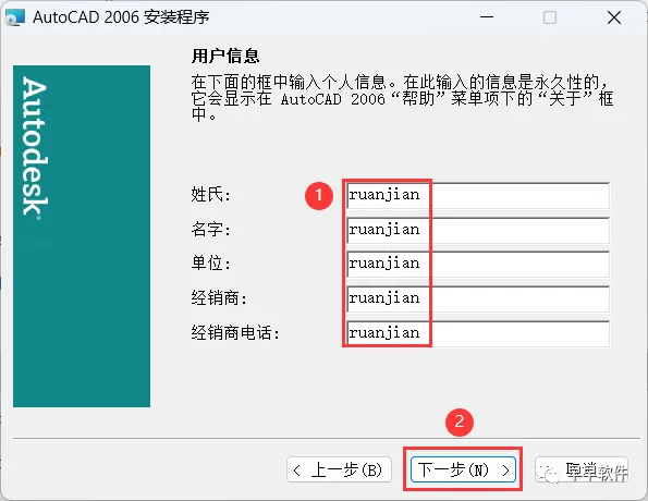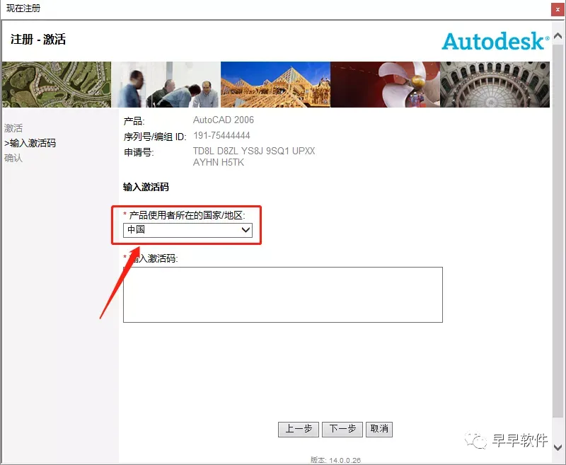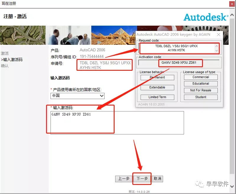 22、打开软件界面,将软件的【申请号】填入到程序的【Requset Code】内,再将程序的【Activation Code】填入到软件的【激活码】内,再点击【下一步】