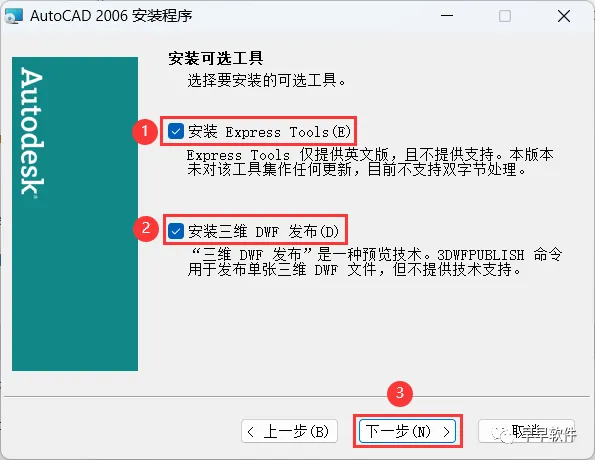 10、勾选【安装Express Tool】和【安装三维DWF发布】,再点击【下一步】