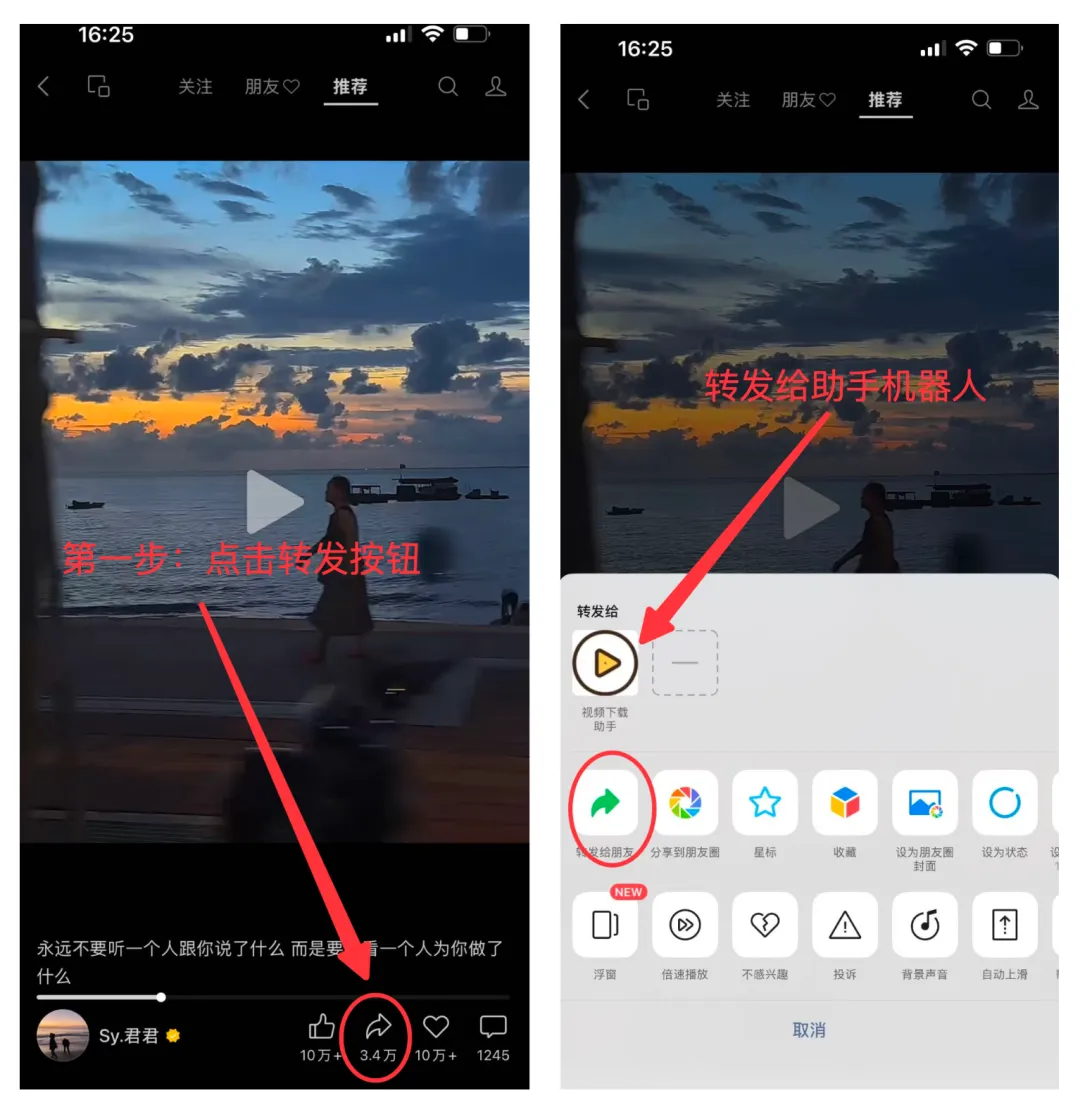 打开视频号视频,点击下方的分享按钮,把视频转发分享给下载助手机器人。