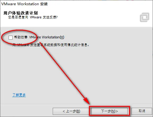 8、取消勾选帮助改善VMware Workstation,点击“下一步”