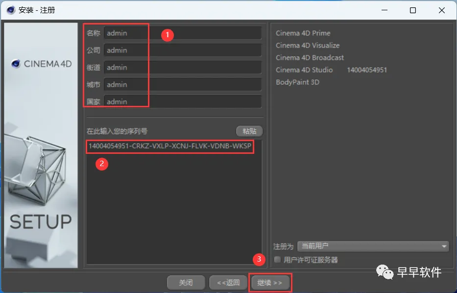 7、随意填写,序列号输入:14004054951-CRKZ-VXLP-XCNJ-FLVK-VDNB-WKSP,再点击【继续】