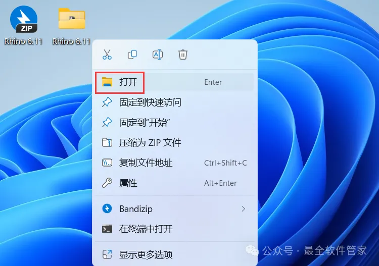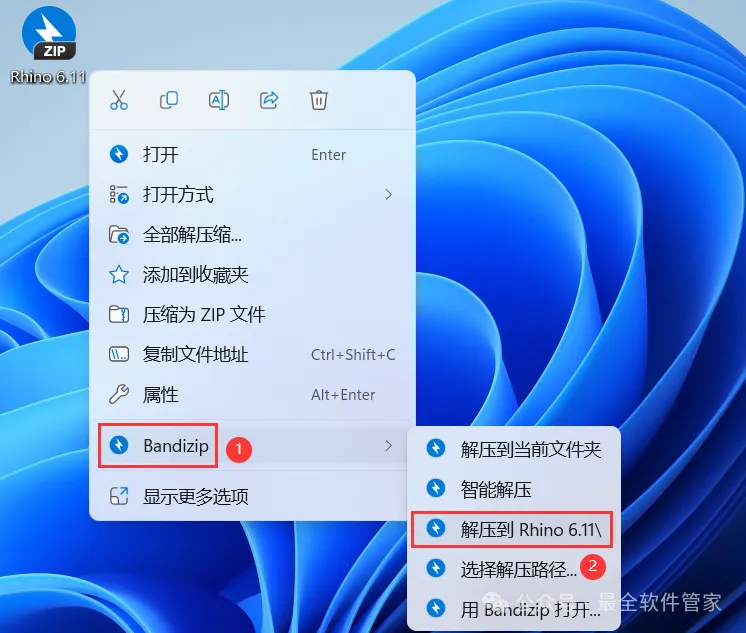 1、下载Rhino 6.11软件安装包到电脑上,右键选择【解压到Rhino 6.11\】