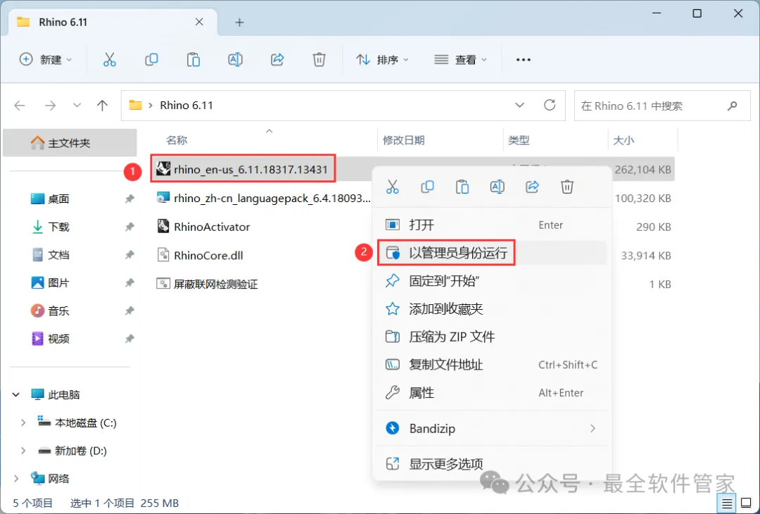 3、找到【rhino_en_us_6.11】应用程序,右键选择【以管理员身份运行】它