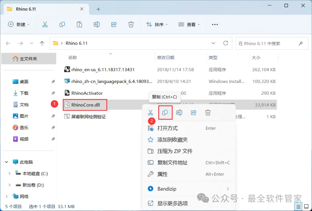 10、回到Rhino 6.11文件夹,找到【RhinoCore.dll】文件,再右键点击【复制按钮】