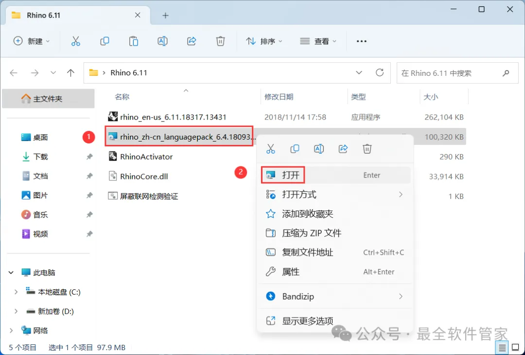 14、回到Rhino 6.11文件夹,找到【rhino_zh_cn…】程序,再右键【打开】它