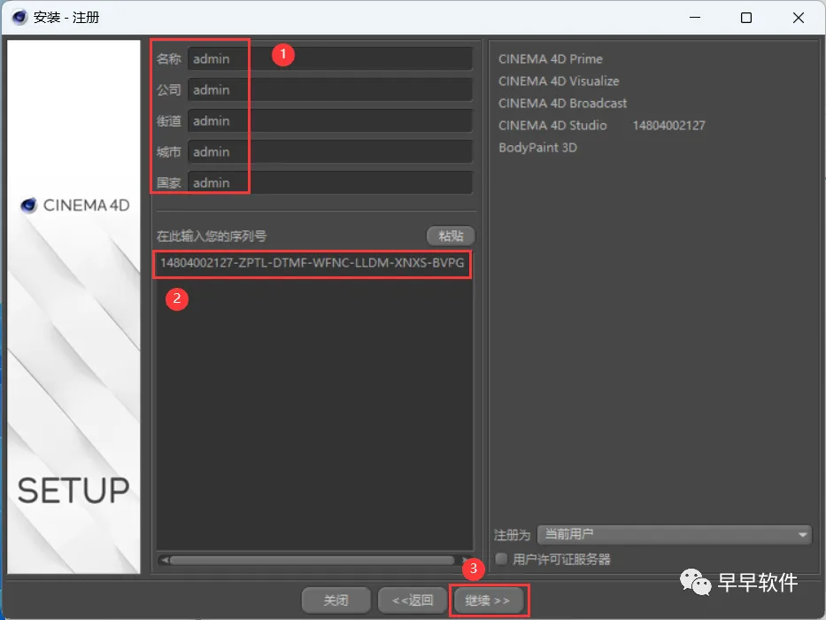 7、随意填写,序列号输入:14804091864-TWLR-HBDM-VCLL-BZND-TLZZ-MVTC,再点击【继续】