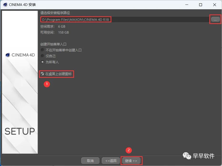 11、软件默认安装在C盘,可自定义更改软件安装位置,这里小编选择安装在D盘;勾选【在桌面上创建图标】,再点击【继续】