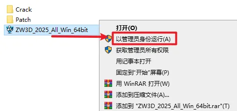 2.打开解压好的文件夹,选中“ZW3D_2025_All_Win_64bit”安装程序,右键选择“以管理员身份运行”