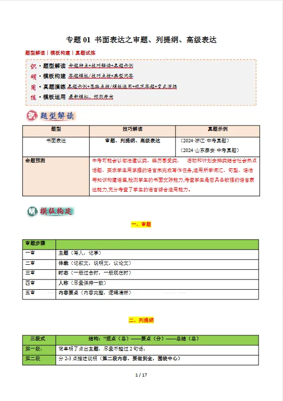 1.「专题01 书面表达之审题、列提纲、高级表达 (答题模板)(原卷+解析版).pdf」