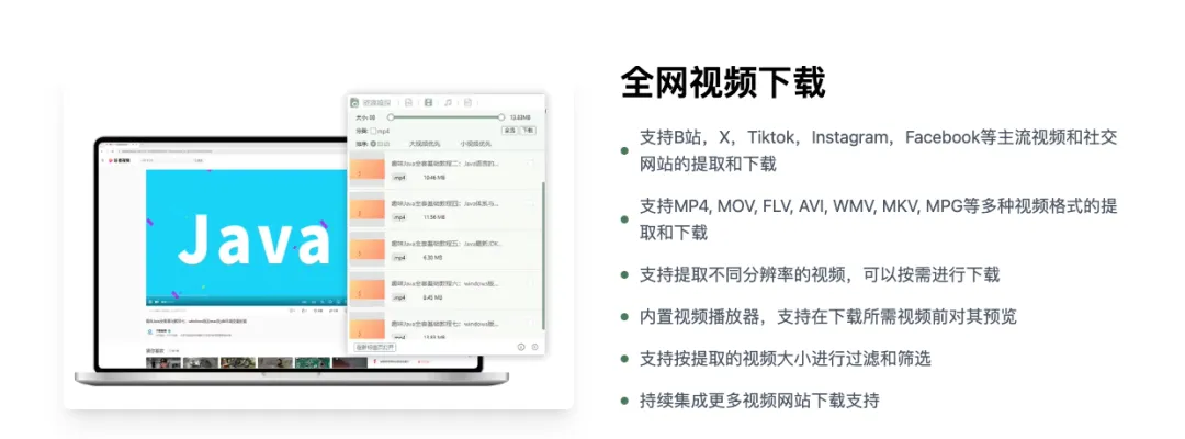 多种格式(MP4、MOV、FLV、AVI、MKV)和分辨率任你选,内置播放器可以先预览再下载,不满意的不要!