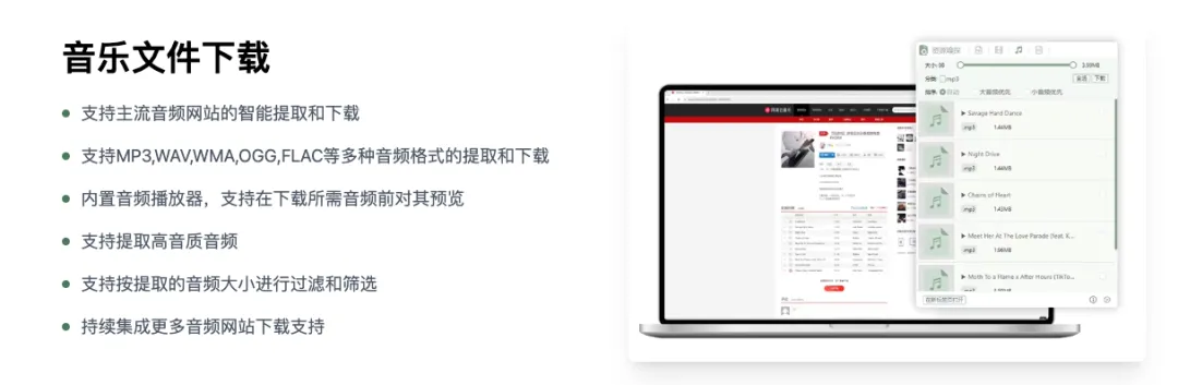同样内置播放器,先试听再下载,支持高品质音频提取。