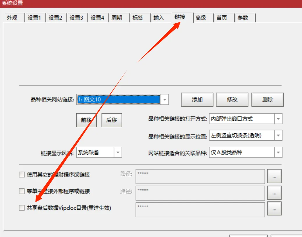 然后随便打开一个软件,进入系统设置==也可以快捷键Ctrl+D---点链接--下方有个共享数据栏!
