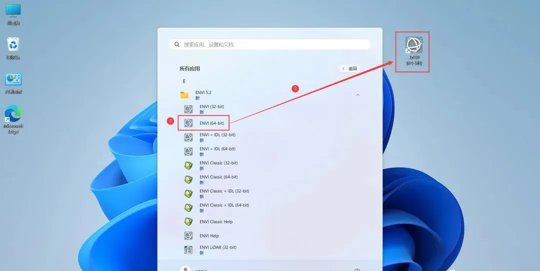 12、回到桌面,点击任务栏的【开始菜单】,在【所有应用】中找到【ENVI(64-bit)】软件图标】,将软件图标拖到桌面上,完成软件桌面快捷方式的创建