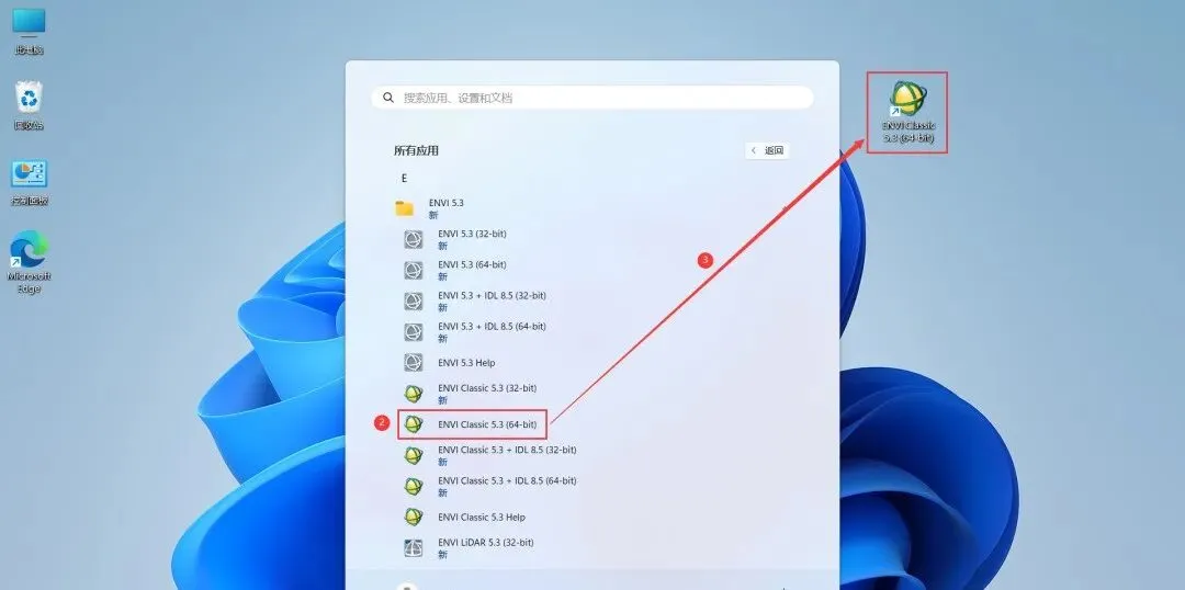 17、回到桌面,点击任务栏的【开始菜单】,在【所有应用】中找到【ENVI Class 5.3(64-bit)】软件图标】,将软件图标拖到桌面上,完成软件桌面快捷方式的创建