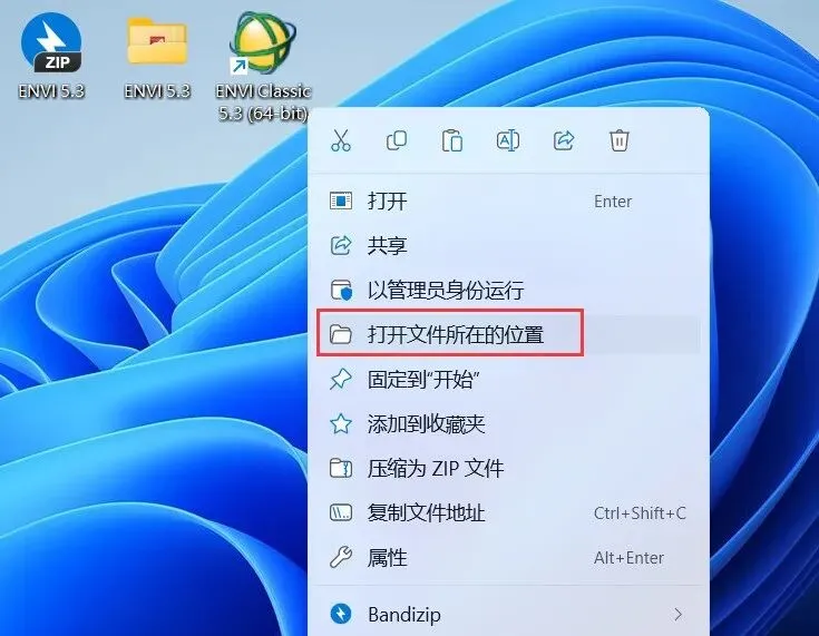 18、右键桌面上的【ENVI Class 5.3(64-bit)软件图标】,点击【打开文件所在的位置】