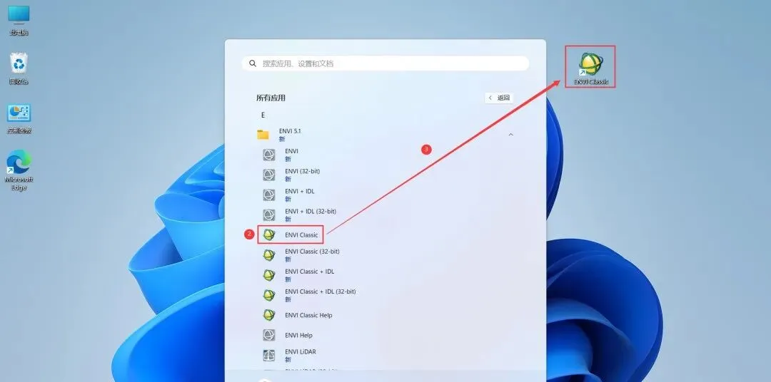 17、回到桌面,点击任务栏的【开始菜单】,在【所有应用】中找到【ENVI Class】软件图标】,将软件图标拖到桌面上,完成软件桌面快捷方式的创建